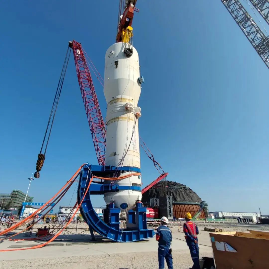 2022年8月,“華龍一號(hào)”漳州核電2號(hào)機(jī)組穩(wěn)壓器通過“主設(shè)備預(yù)引入法”順利吊裝就位,巨力索具通過項(xiàng)目現(xiàn)場移動(dòng)式翻轉(zhuǎn)支座、翻轉(zhuǎn)抱環(huán)、拉緊裝置,提供吊桿及吊梁等翻轉(zhuǎn)吊裝產(chǎn)品,使用3200t吊車在反應(yīng)堆廠房外翻轉(zhuǎn)、吊裝引入至穩(wěn)壓器間,全程保障項(xiàng)目吊裝順利進(jìn)行。