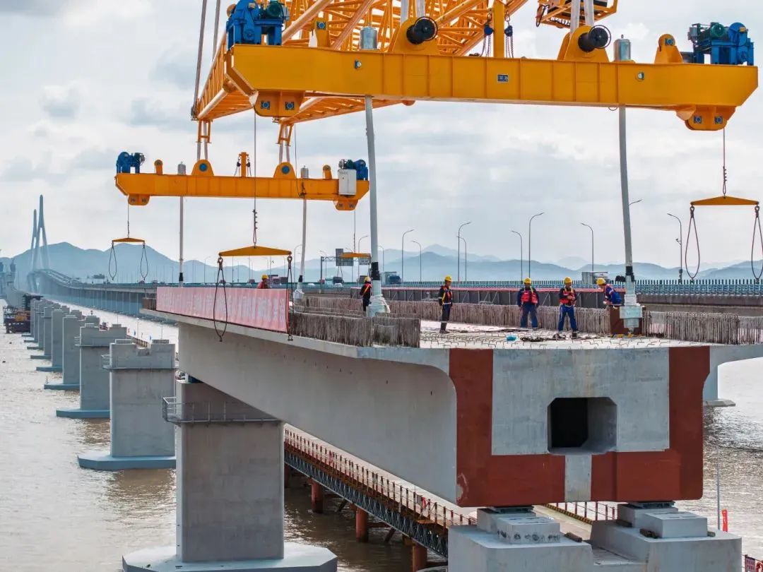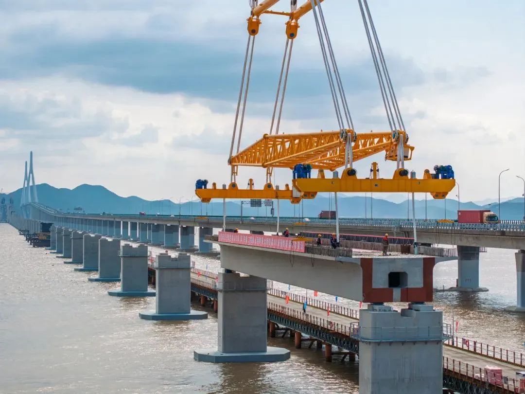 11月5日,隨著現(xiàn)場指揮一聲令下,國內(nèi)首座市域(郊)鐵路跨海大橋,重1700噸的預制箱梁穩(wěn)穩(wěn)落至橋墩上,巨力索具箱梁吊具全程保障首榀箱梁成功架設,標志著大橋全面進入上部結(jié)構(gòu)施工階段。