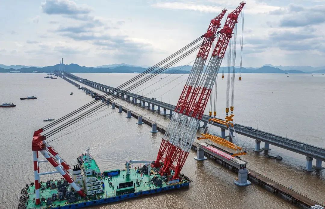 大橋橫跨象山港海域,面臨著深水、強風、潮汐等眾多不利因素,環(huán)境情況復雜多變。橋面至海面距離最大約為52米,接近20層樓的高度,且毗鄰既有象山港公路大橋,操作空間狹小,對吊具穩(wěn)定性、吊裝精度和施工穩(wěn)定性要求極高。