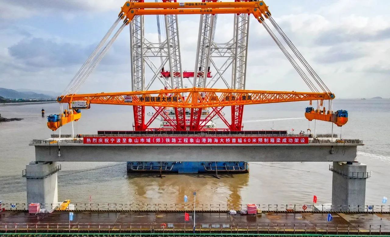大橋海上架設預制箱梁共66榀,每榀梁長60米,寬10.6米,重約1700噸,吊具重280噸,總體起吊總重1980噸,是國內(nèi)市域(郊)鐵路工程跨度最大、噸位最重的預應力混凝土預制箱梁。