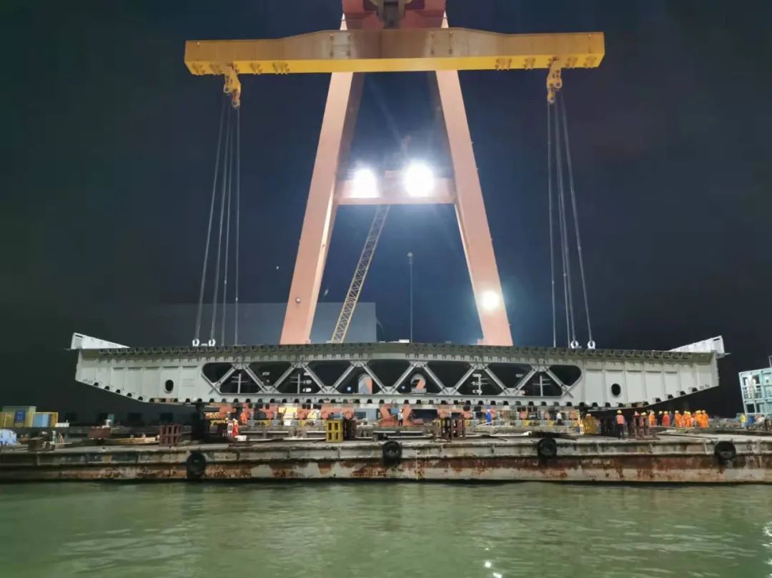 深中通道G05標(biāo)段泄洪區(qū)及淺灘區(qū)鋼箱梁大節(jié)段XG9L的出海平臺方案為世界首創(chuàng)的出海運輸方案,整個運輸過程使用8臺模塊車,4臺移梁平車,頂升運載能力可達2000噸。經(jīng)過三次頂升及運輸,將鋼箱梁大節(jié)段XG9L從存梁區(qū)運至待裝船區(qū),由世界第二起重能力的“天一號”運架一體船將鋼箱梁吊運至橋址。