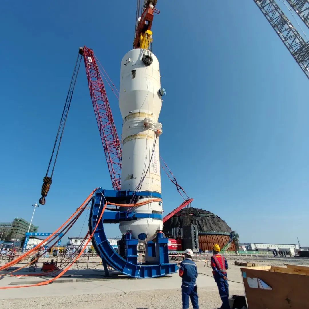ZH-65型蒸汽發(fā)生器是華龍一號機(jī)組最核心的設(shè)備之一,它的體積巨大,結(jié)構(gòu)復(fù)雜而精細(xì),自接到吊裝任務(wù),巨力索具項目團(tuán)隊首先清晰形勢和任務(wù),統(tǒng)一大局意識和服務(wù)意識,明確各階段吊裝目標(biāo)和方向,吊裝方案采用新型翻轉(zhuǎn)裝置,該裝置利用重力和杠桿原理,無需特殊固定措施就能使主設(shè)備和翻轉(zhuǎn)支架形成一個整體,對比傳統(tǒng)的固定支架安裝調(diào)整以及安裝、拆卸抱環(huán)等工序,操作容易、安全性高,人因失誤概率低,極大提升了施工效率和安全。