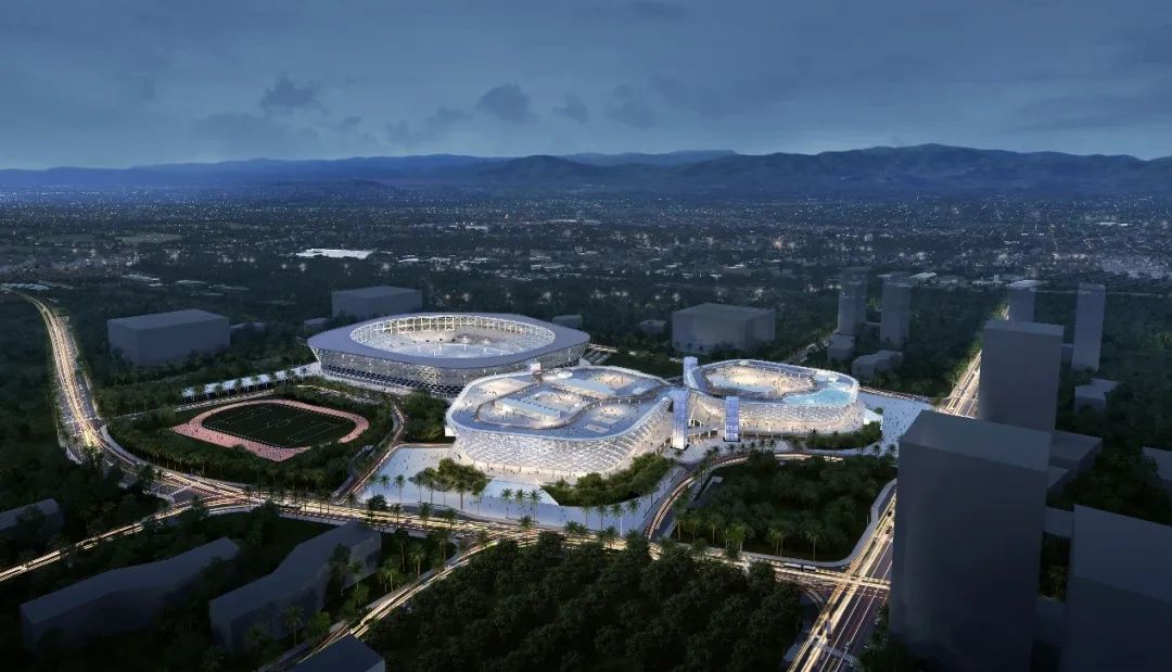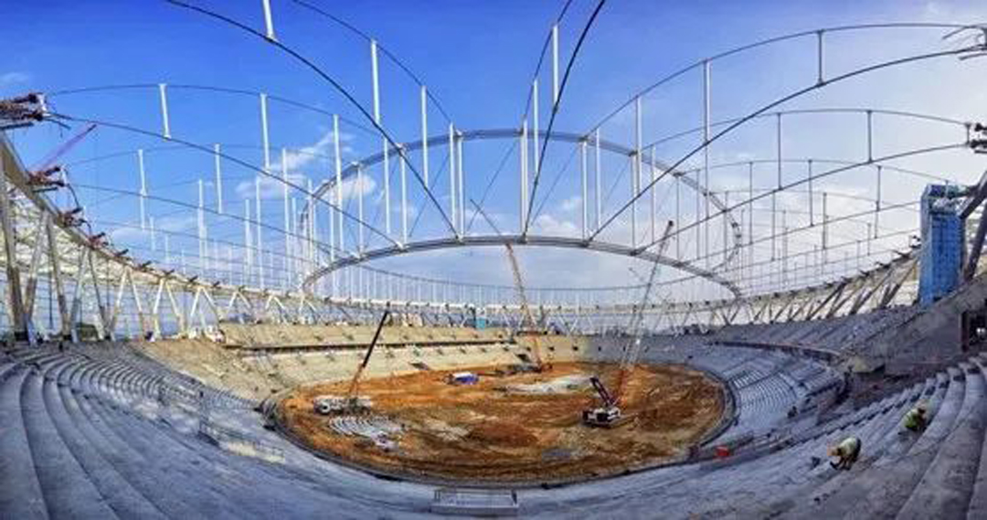該體育場整體外輪廓平面投影為不規(guī)則的倒角五邊形,其外輪廓南北最大長度約305米,東西約270米,罩棚最高點(diǎn)標(biāo)高約46米。從體育場內(nèi)的觀眾席處仰望,一根根鋼索交織連接,各自用力拉伸,巨大鋼網(wǎng)架躍然呈現(xiàn),好似一座兼具了力學(xué)、美學(xué)、科技的藝術(shù)品。