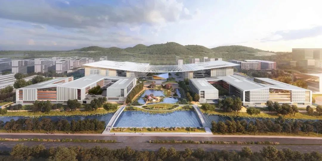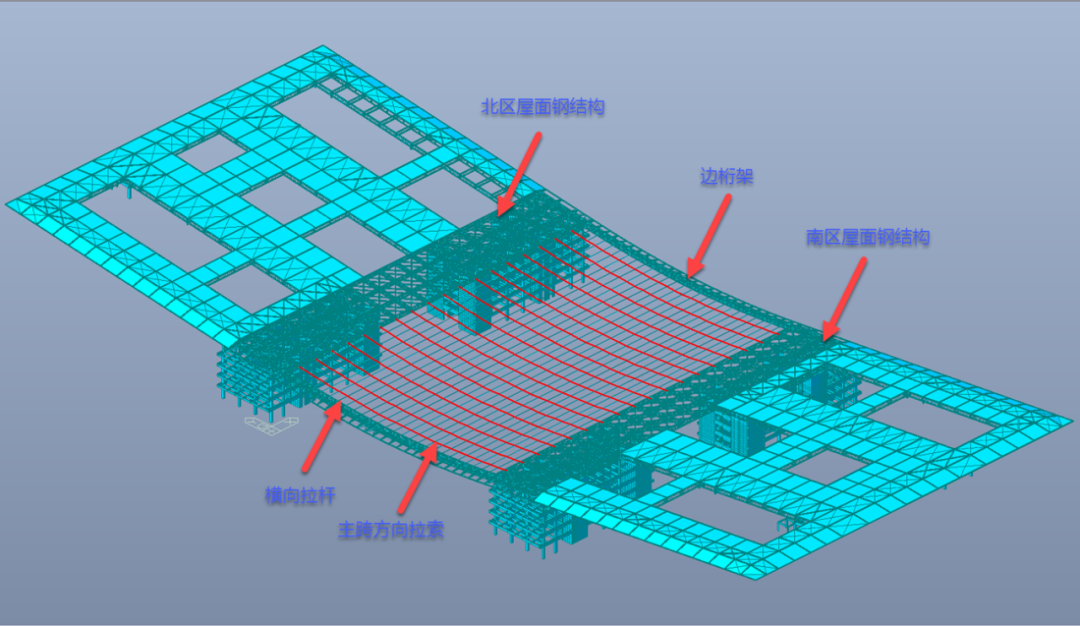 基座由行政樓、圖書館、音樂廳、發(fā)展用房和公共教學(xué)樓組成,統(tǒng)稱為“中心組團”,是校內(nèi)的研究和學(xué)習(xí)中樞。大屋面鋼結(jié)構(gòu)體系,由北區(qū)鋼桁架體系、中央?yún)^(qū)懸鏈線索結(jié)構(gòu)和南區(qū)鋼桁架體系組成,鋼結(jié)構(gòu)總量約8000噸。