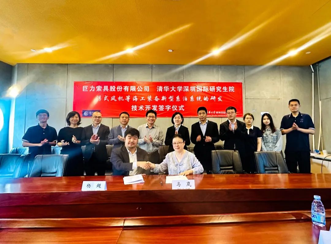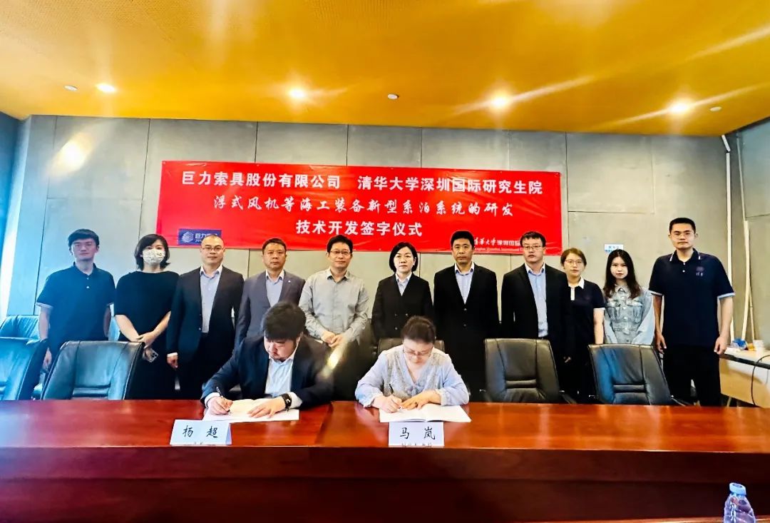 2023年4月13日,巨力索具與清華大學(xué)深圳國(guó)際研究生院就浮式風(fēng)機(jī)等海上漂浮式構(gòu)筑物新型系泊系統(tǒng)的研發(fā)達(dá)成技術(shù)開發(fā)合作關(guān)系并舉行簽約儀式。