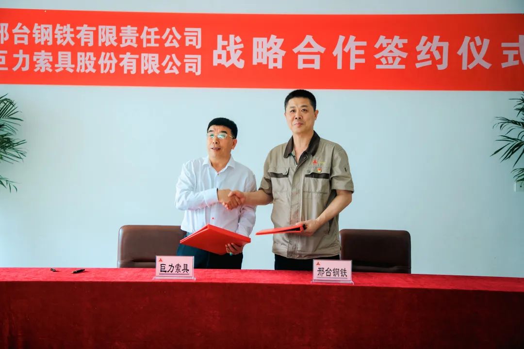 2023年6月19日,巨力索具與邢臺鋼鐵簽訂戰(zhàn)略合作協(xié)議,邢臺鋼鐵董事長張育明,巨力索具董事長楊建國、總裁楊超出席簽約儀式,并就合作情況展開詳細(xì)座談。