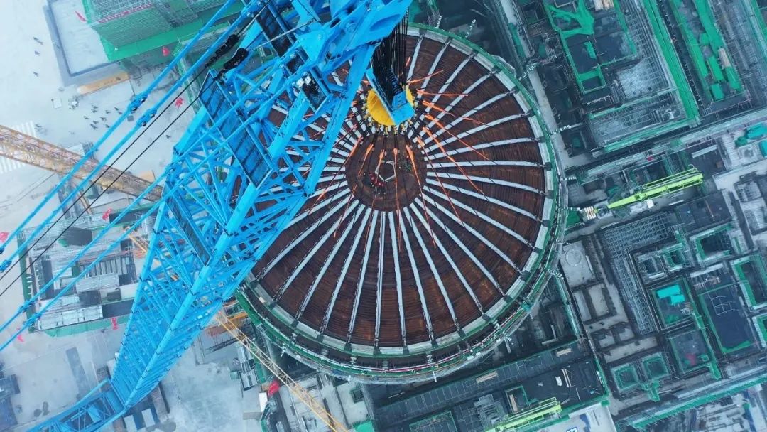 吊裝過程中,穹頂宛如一個巨型“帽子”,它是保證反應(yīng)堆廠房安全殼完整性和密封性的重要組成部分。據(jù)了解,本次穹頂?shù)跹b呈現(xiàn)整體吊、物項(xiàng)多、總重大、精度高等特點(diǎn),包含鋼襯里結(jié)構(gòu)以及支撐籠架、部分鋼筋和預(yù)應(yīng)力導(dǎo)管、全部貫穿件、加強(qiáng)板、內(nèi)部鋼結(jié)構(gòu)、設(shè)備支吊架、噴淋系統(tǒng)、照明系統(tǒng)、消氫裝置、換熱器設(shè)備、探測設(shè)備等設(shè)備,總重量為739.016噸。