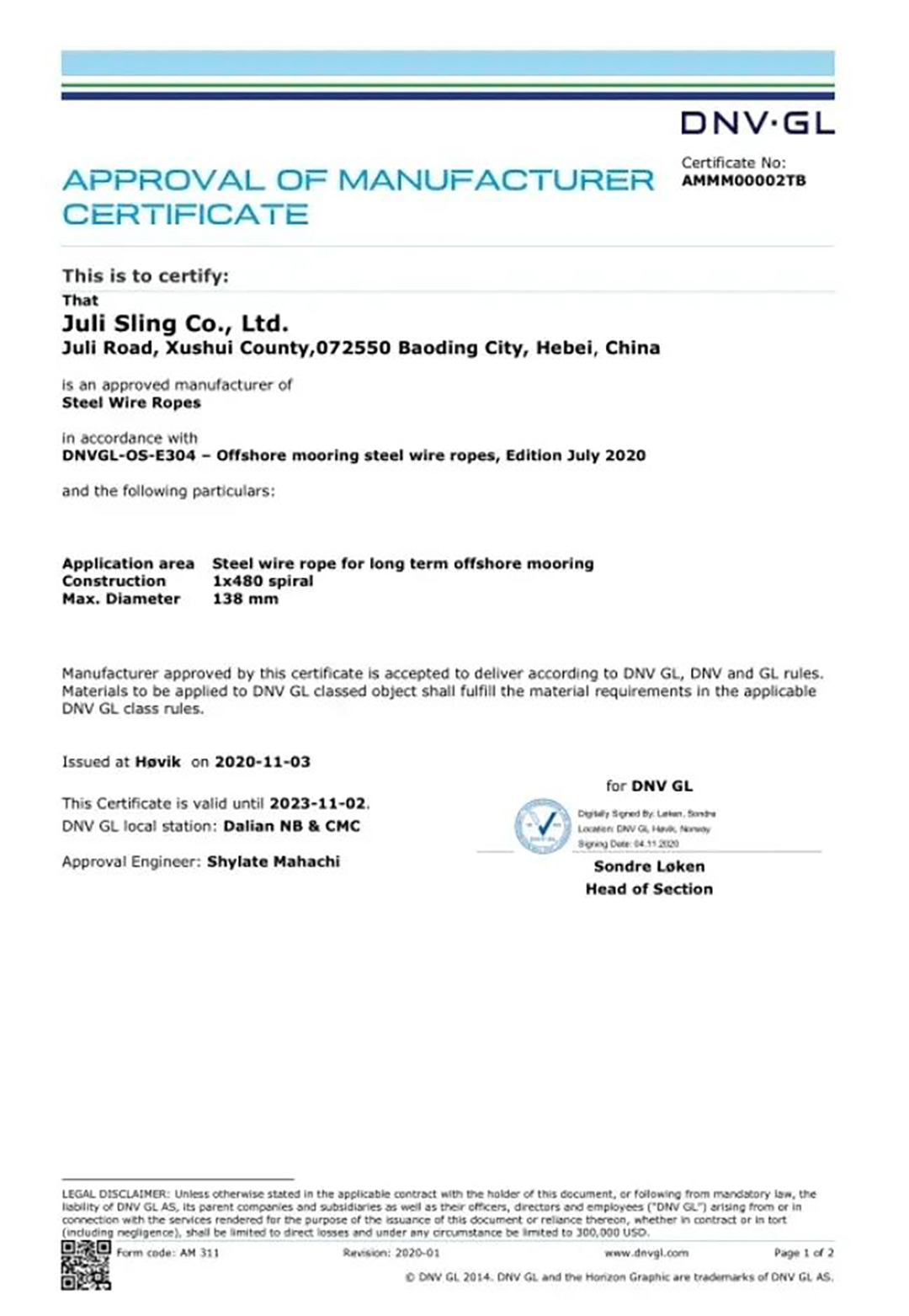 2020年11月,巨力索具取得了永久系泊用單股涂塑鋼絲繩的DNV·GL工廠認(rèn)可證書,成為國(guó)內(nèi)首家通過(guò)該類鋼絲繩DNV·GL工廠認(rèn)可的廠家。