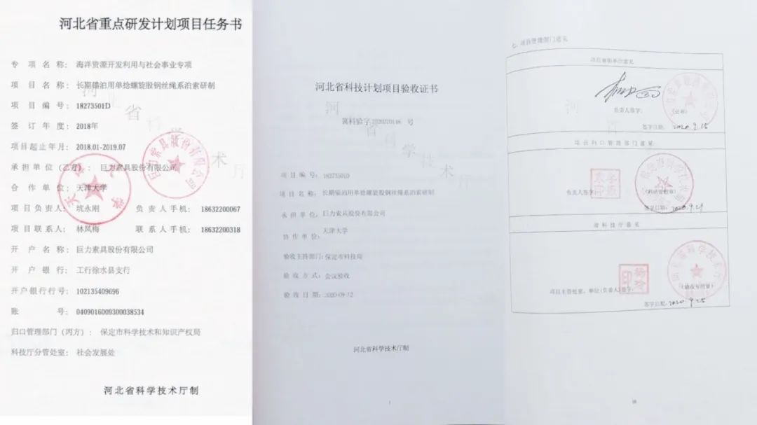 2020年9月12日,巨力索具“長(zhǎng)期錨泊用單捻螺旋股鋼絲繩繩系泊索研制”通過(guò)了河北省科技廳組織的驗(yàn)收,項(xiàng)目完成了長(zhǎng)期錨泊系泊索索體、閉式澆鑄接頭、彎曲限制器的產(chǎn)品研發(fā),形成了系泊索集成設(shè)計(jì),集成配套的能力。